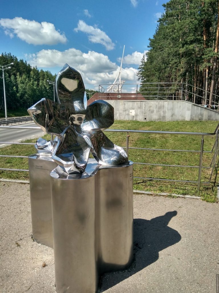 Мы несколько раз проезжали в сторону Первоуральска мимо одной из таких стел. В этот раз решили мимо не проезжать. Эта стела самая легкодоступная из всех. Находится от Екатеринбурга в 17 км. Обелиск установили в 2004 году по проекту скульптора Константина Грюнберга. Его форма символизирует переплетённые буквы Е и, А, а в основании заложены камни с самой восточной и с самой западной точек Евразии — мыса Дежнёва и мыса Рока. Вот букву, А я увидела, а Е нет.