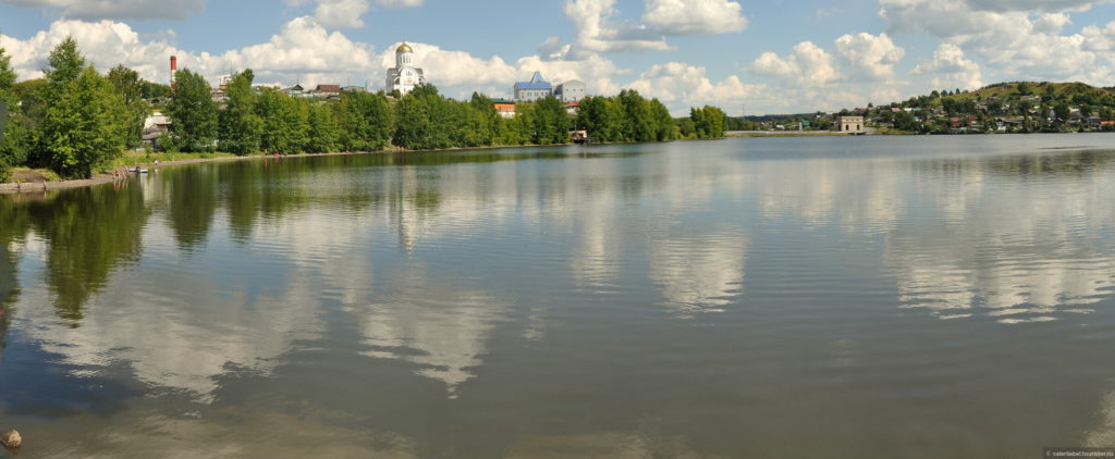 Мы заехали в город мимо предприятия и красивого здания заводоуправления. Смысла подниматься на гору Угольная я не видела, т. к. в связи с пандемией «Демидов-Центр» не работал. А остальное можно посмотреть издалека. Поэтому начали знакомство с городом с городского пруда. Отсюда открывается хороший вид на гору Угольную, завод, воссозданный храм на месте взорванного в советское время Архистратига Михаила