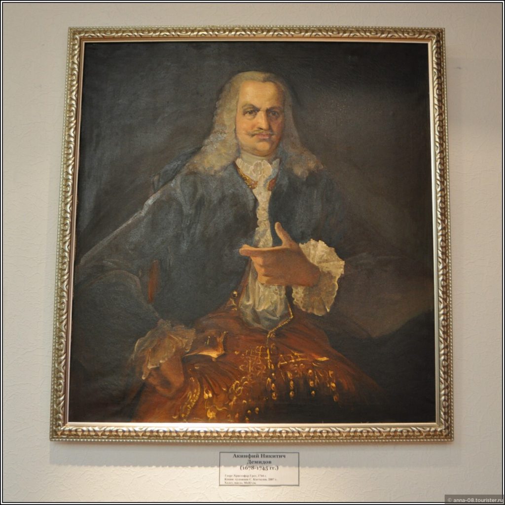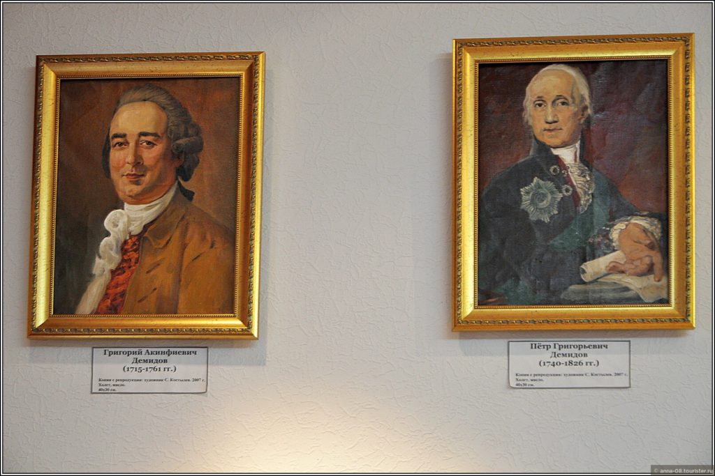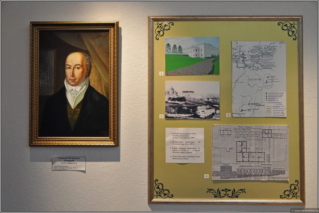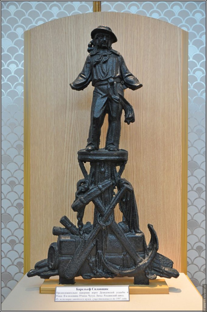Зал посвящен истории династии Демидовых, на стенах родословная, герб, информация о наиболее выдающихся представителях династии, их благотворительной деятельности. Среди экспонатов — чугунная ступенька лестницы демидовской усадьбы, детали ограды. Мне помешали фотографировать расставленные стулья, видимо накануне была какая-то экскурсия.