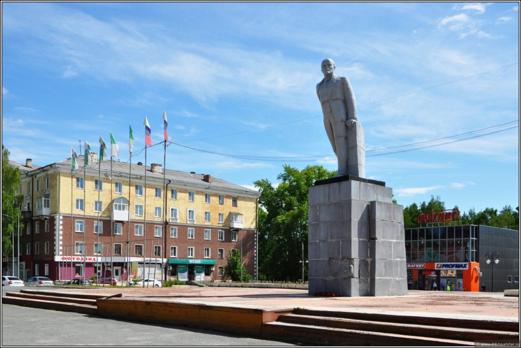 На площади Победы стоит памятник Ленину.