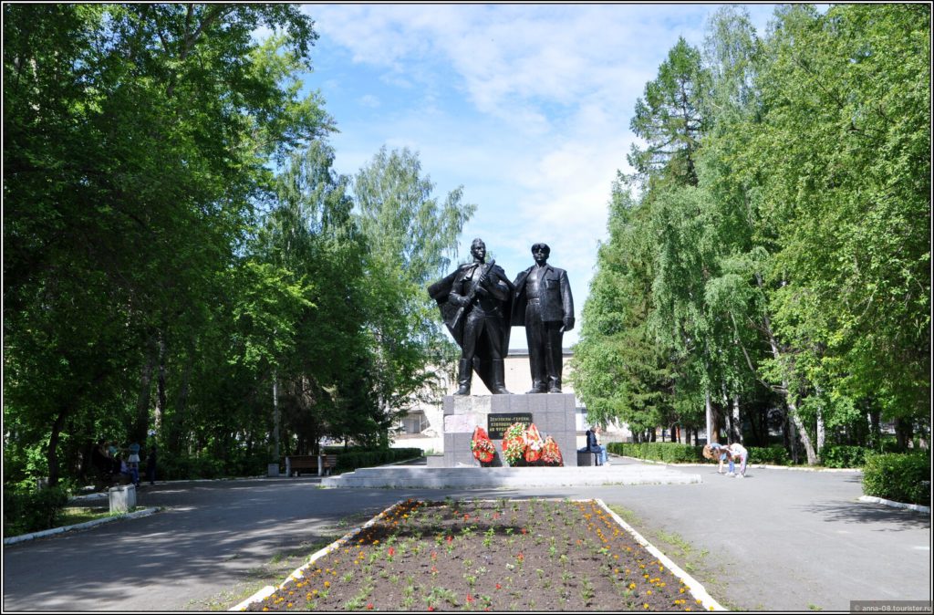 За памятником — современный торговый центр и, похоже, бывший кинотеатр, а теперь Культурно-досуговый центр «Победа». За ними еще один городской парк — Парк Победы.
